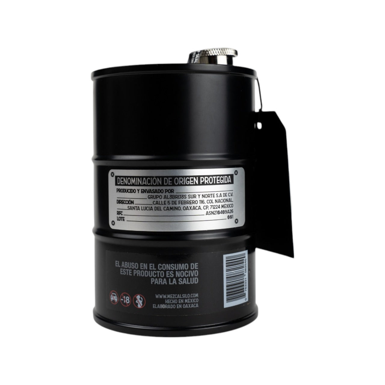 Botella distintiva de acero inoxidable, diseñada para preservar la pureza y el sabor del mezcal. 38% Alc. Vol.